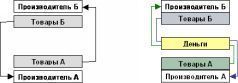 При множестве производителей схему товарообмена с использованием денег можно упрощённо представить следующим образом. Жёлтые стрелки – это движение денег.