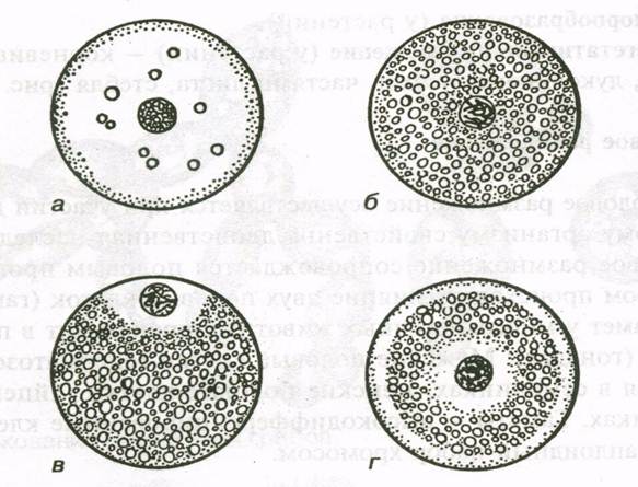 Рис. 1. Типы яйцеклеток по распределению желтка: а – алецитальная, б – изолецитальная, в – телолецитальная, г – центролецитальная.