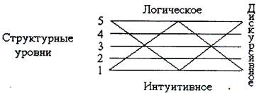 Представлена в виде двух проникающих одна в другую сфер. Их внешние границы – абстрактные пределы мышления. Снизу находится сфера интуитивного мышления, за ним сфера строго интуитивного мышления животных. Сверху – логического мышления. За ним простирается сфера строго логического мышления, например, современных электронно-вычислительных машин. Критерий творческого процессауровневый переход: потребность в новом знании складывается на высшем уровне организации творческой деятельности; средства удовлетворения этой потребности складывается на низких структурных уровнях. Они включаются в процесс, происходящий на высшем уровне, что приводит к возникновению нового способа взаимодействия субъекта с объектом и возникновению нового знания. Тем самым творческий продукт предполагает включение интуиции (роль бессознательного) и не может быть получен на основе логического вывода.
