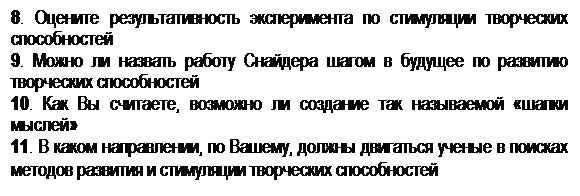 1. Сила нервной системы определяется индивидуально-различной способностью выдерживать длительное или интенсивное возбуждение без перехода в тормозное состояние. Эксперименты Ермолаевой-Томиной Л.Д. показали, что для каждого испытуемого существует свой «порог пробуждения» творческого начала. У кого-то на самом простом задании. У других творческий процесс возникал при легкой провокации или после подсказки. А у третьих — только на самом сложном задании. Однако наиболее интересными были данные тех немногочисленных испытуемых, которые одинаково творчески выполняли все типы заданий. Для них было характерно автоматическое включение творчества, которое Ермолаева-Томина Л.Д. описывает как показатель креативности. Она доказала что нестандартное сочетание высокой чувствительности и реактивности с потребностью и способностью к напряженной интеллектуальной деятельности является наиболее благоприятным нейрофизиологическим задатком для спонтанного формирования креативности.
