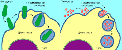 Захват плотных частиц, таких, как бактерии, называют фагоцитозом. Многие одноклеточные организмы питаются таким способом (амеба). Поглощение растворенных веществ называют пиноцитозам. Пиноцитоз встречается как у одноклеточных, так и у многоклеточных организмов. Хотя фагоцитоз и пиноцитоз на первый взгляд отличаются от мембранных транспортных систем с участием молекул-переносчиков, они имеют ту же основу. Все эти механизмы зависят от способности мембраны "узнавать" определенные молекулы.