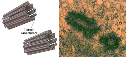 Центриоль является постоянным компонентом клеточного центра. Внутренняя часть центриоли обладает небольшой плотностью в отличие от стенки, имеющей высокую плотность. Стенка образована трубочками, расположенными параллельно друг другу, от которых отходят перпендикулярные тельца - сателлиты. Число трубочек - 9. Центриоли обычно бывают парными и расположены перпендикулярно друг другу, причем такая ориентация может сохранятся и при их расхождении для образования полюсов во время деления клетки.