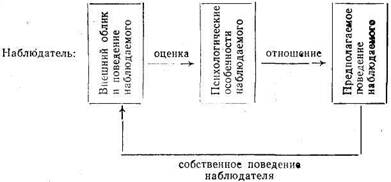 Рассмотрим на гипотетическом примере, как в общем виде разворачивается процесс восприятия одним человеком (назовем его наблюдателем) другого (наблюдаемого). В наблюдаемом ему доступны для восприятия лишь внешние физические признаки, среди которых наиболее информативными являются внешний облик (физические качества плюс оформление внешности) и поведение (совершаемые действия и экспрессивные реакции). Воспринимая эти качества, наблюдатель определенным образом оценивает их и делает некоторые умозаключения (часто бессознательно) о внутренних психологических свойствах партнера по общению. Сумма свойств, приписанных наблюдаемому, в свою очередь дает человеку возможность сформировать определенное отношение к нему (это отношение чаще всего носит эмоциональный характер и располагается в пределах континуума «нравится — не нравится»). На основании предполагаемых у наблюдаемого психологических свойств наблюдатель делает определенные выводы относительно того, какого поведения по отношению к нему, наблюдателю, можно ожидать от воспринимаемого лица, а затем, опираясь на эти вопросы строит собственную стратегию поведения по отношению к наблюдаемому человеку. Поясним сказанное на примере. Человек, стоящий поздним вечером на автобусной остановке, замечает приближающегося пешехода. Тот одет в темную одежду, держит руки в карманах и двигается быстрой, решительной походкой. Если стоящий на остановке человек спокоен и уверен в себе, он может подумать приблизительно так: «Этот человек, видимо, замерз и очень опешит. Наверное, опаздывает домой или на свидание. Сейчас он пройдет спокойно мимо». И подумав подобным образом, наблюдатель тоже спокойно продолжит свое ожидание.