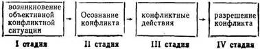 Динамика конфликта, то есть закономерности его развития находятся в полном соответствии с его структурой. Можно выделить 4 основных стадии развития конфликта: