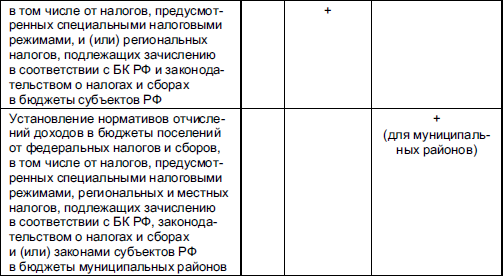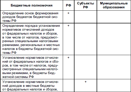 Разделение и законодательное закрепление бюджетных полномочий за каждым уровнем власти является неотъемлемым условием построения межбюджетных отношений в РФ в русле бюджетного федерализма. Основное правило заключается в том, что установление общих принципов организации и функционирования бюджетной системы РФ, рамочного регулирования бюджетного процесса и межбюджетных отношений закрепляется за федеральным уровнем, что является реализацией принципа единства бюджетной системы РФ. При этом государственные органы власти субъектов РФ и органы местного самоуправления в соответствии с принципом самостоятельности наделяются широкими, но законодательно ограниченными правами по осуществлению бюджетного процесса на своей территории. Рассмотрим на примере отдельных блоков бюджетных правоотношений, как осуществляется распределение бюджетных полномочий по уровням бюджетной системы РФ (табл. 2.1–2.6).