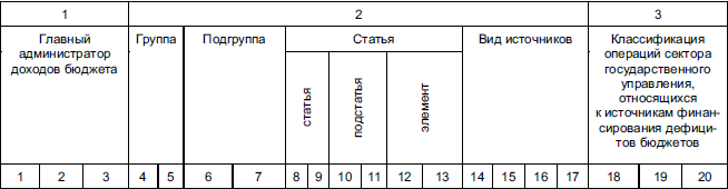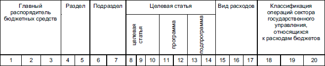 С целью соблюдения единых принципов формирования и исполнения бюджетов введен единый 20‑значный код для классификации доходов, расходов и источников финансирования дефицита бюджетов. Три первых знака 20‑значного кода являются кодами администраторов бюджетных средств, соответствующих перечню главных распорядителей средств соответствующего бюджета. Однако в законодательстве термин «администратор» применяется в отношении доходов и источников финансирования дефицита бюджета. В отношении расходов применяется традиционный термин – главный распорядитель бюджетных средств. Вторая часть (14 знаков) представляет собой, собственно, функциональную структуру (разделы, подразделы, статьи, подстатьи, виды, группы, подгруппы, элементы, программы) соответствующей бюджетной классификации. Три последних знака 20‑значного кода являются классификацией операций сектора государственного управления (табл. 3.1–3.3).