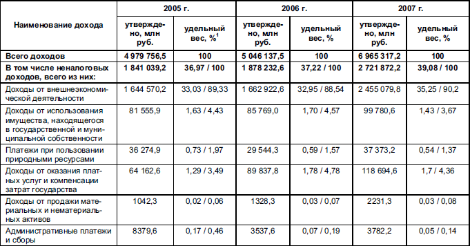 С 2005 г. происходит резкое увеличение удельного веса неналоговых доходов федерального бюджета (до 37 %) за счет включения в их состав таможенных пошлин и сборов (для сравнения: в 2002 г. этот показатель составил 5 %, в 2003 г. – 6, в 2004 г. – 8 %). Состав и структура неналоговых доходов федерального бюджета РФ в 2005–2007 гг. приведены в табл. 4.3.