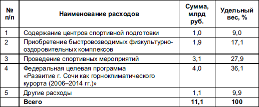 Постановлением Правительства РФ от 11.01.2006 г. № 7 утверждена Федеральная целевая программа «Развитие физической культуры и спорта в Российской Федерации на 2006–2015 гг.». Общий объем финансирования программы составляет 106,6 млрд руб., в том числе за счет средств федерального бюджета – 53,6 млрд руб. (50,3 %); бюджетов субъектов Российской Федерации – 48,0 млрд руб. (45,0 %); внебюджетных источников – 5,0 млрд руб. (4,7 %). Основной объем средств планируется направить на капитальные вложения (105,2 млрд руб., или 98,6 %). Предполагается, что в результате реализации Программы: