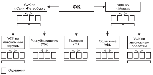Главное управление Федерального казначейства существовало в статусе департамента Министерства финансов РФ. В соответствии с Указом Президента от 09.03.2004 г. № 314 Федеральное казначейство было образовано в статусе федеральной службы с приемом правоприменительных функций Министерства финансов РФ по обеспечению исполнения федерального бюджета. Федеральное казначейство осуществляет свою деятельность непосредственно и через свои территориальные органы во взаимодействии с другими федеральными органами исполнительной власти, органами исполнительной власти субъектов РФ, органами местного самоуправления, Центральным банком РФ, общественными объединениями и иными организациями. В систему территориальных органов входят управления по субъектам РФ и отделения по городам и районам. Таким образом, создана трехуровневая структура органов Федерального казначейства, которая представлена на рис. 10.1.