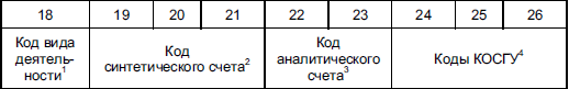 Единый план счетов бюджетного учета состоит из 5 разделов: 1 – нефинансовые активы, 2 – финансовые активы, 3 – обязательства, 4 – финансовый результат, 5 – санкционирование расходов бюджета. Номера счетов Единого плана счетов бюджетного учета состоят из 26 разрядов и имеют следующую структуру [62]: