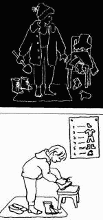 Андрею уже шесть лет. По справедливому требованию родителей, он должен сам одеваться, когда идет гулять. На улице зима, и нужно надеть на себя много разных вещей. Мальчик же «буксует»: то наденет только носки и сядет в прострации, не зная, что делать дальше; то, надев шубу и шапку, готовится выйти на улицу в домашних тапочках. Родители приписывают все лености и невнимательности ребенка, упрекают, понукают его. В общем, конфликты продолжаются изо дня в день. Однако после консультации с психологом все меняется. Родители составляют список вещей, которые ребенок должен надеть. Список оказался довольно длинным: целых девять пунктов! Ребенок уже умеет читать по слогам, но все равно около каждого названия вещи родители вместе с мальчиком рисуют соответствующую картинку. Этот иллюстрированный список вешают на стену.