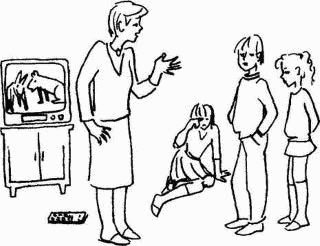 АНЯ: Она включила, а он переключил, а она снова включила, а тогда он ее толкнул... от так... (Показывает.)