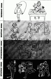 Найти золотую середину между попустительским и авторитарным стилями нам помогает образ четырех цветовых зон поведения ребенка: зеленой, желтой, оранжевой и красной (идея зон принадлежит одному американскому психологу, мы ее видоизменяем и дополняем по‑своему).