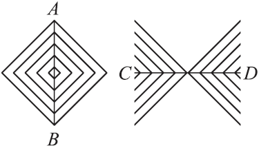 Но даже и после того, как вы уже узнали, что прямые АВ и CD равны, они продолжают вам казаться неравными. Поверните книгу, чтобы прямая АВ шла справа налево, a CD к вам, – все‑таки они будут казаться неравными. Причина зрительного обмана кроется не в направлениях сравниваемых линий, а в тех косых линиях, которые к ним примыкают: возле прямой АВ они сходятся, а возле CD – расходятся.