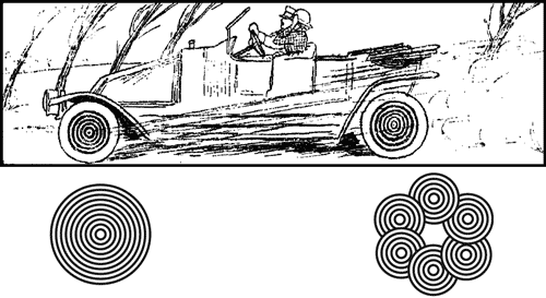 Итак, перед вами несколько концентрических кругов, с которыми нам предстоит проделать поучительный опыт. Возьмите книгу в руки и, глядя все время на эти круги (лучше направить взгляд не в самый их центр, а в какую‑нибудь боковую точку), вращайте медленно книгу. Что произойдет при этом с кругами? Нечто непредвиденное: вам покажется, что круги тоже вертятся на бумаге в ту сторону, куда вы вращаете книгу, т. е. что они словно освободились от бумаги, на которой начерчены, и свободно вращаются – с такою же скоростью, как и книга. Ускорьте вращение книги – ускорится и вращение ваших кругов; остановите книгу – вращение кругов сразу прекратится. Вращайте книгу попеременно туда и назад – круги будут повторять это движение.