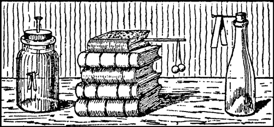 Если вам не дается искусство мастерить, вы можете устроить электроскоп еще проще; он будет не так удо – бен и чувствителен, но все же пригоден к употреблению. Подвесьте к деревянной палочке на ниточках два шарика из бузинной сердцевины так, чтобы, свешиваясь, они соприкасались. Вот и электроскоп: прикоснувшись к одному шарику испытуемым предметом, вы заметите, что другой шарик отклонится в сторону, если предмет был наэлектризован.