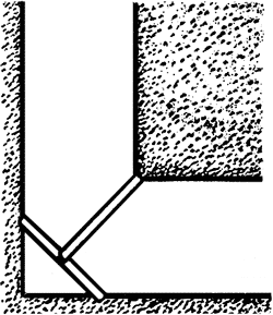 Задача эта может оказаться и практически полезной в том случае, когда, имея две одинаковые жерди, нужно перебросить (не связывая их между собою) мост через канаву, ширина которой как раз равна или даже чуть больше длины одной жерди. Возможно это, впрочем только в том месте канавы, где она поворачивает под прямым углом (рис. 54).
