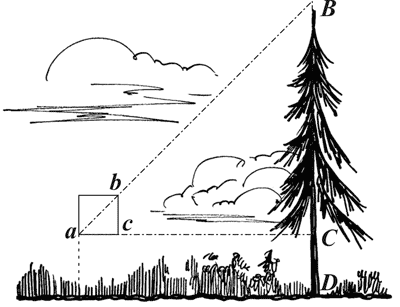 Этим исчерпывается изготовление дальномера. Объясним теперь, как им пользоваться для измерения высот. Пусть вы желаете измерить высоту дерева BD (рис. 57). Вы становитесь на некотором расстоянии от дерева и, держа дальномер так, чтобы нижний край его (близ которого устроено отверстие) располагался горизонтально, смотрите через отверстие на верхушку дерева. Приближаясь к дереву или удаляясь от него, отыскиваете такое место, стоя на котором вы увидите через дырочку а верхушку дерева В, как бы касающуюся верхнего края Ь спичечного коробка (рис. 58). Найдя это место, вам остается лишь измерить расстояние аС от этого места до основания дерева: тем самым вы определите и высоту дерева. Точнее говоря, не полную высоту дерева, а лишь высоту его над горизонтальной линией аС, проведенной на уровне ваших глаз; остается прибавить только кусок СD, который легко измерить непосредственно.