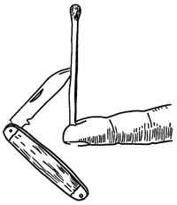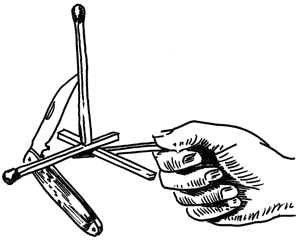 Можно поручиться за то, что товарищ ваш – если только он не посвящен в секрет – не даст верного ответа. Большинство рассуждает примерно следующим образом: так как пламя, дойдя до головки лежащей спички, вспыхнет и тем самым вызовет вспышку прилегающей к ней спички, то раньше загорится та боковая спичка, которая прилегает к головке (на нашем рисунке – правая). В действительности, однако, происходит совсем неожиданная вещь: не загорается ни правая, ни левая из боковых спичек! А как только средняя, горизонтальная спичка перегорит насквозь, две зажимающие ее боковые спички выкинут ее (еще горящую) силою своей упругости, прежде чем пламя успеет дойти до их головок.