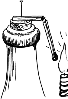 Как же этим свойством воспользоваться, чтобы «зажечь спичку каплей воды»? Секрет, конечно в обстановке опыта. Возле зажженной свечи поставьте бутылку, заткнутую пробкой. С помощью булавки прикрепите к пробке надломанную спичку, как показано на рис. 63‑м.