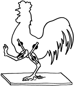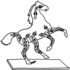 Чтобы такую фигурку оживить, заставить ее двигать своими членами, достаточно положить ее на плоскую тарелку и налить тонкий слой воды. Спички начнут распрямляться, увлекая с собою прилепленные к ним части фигуры, и вы увидите, как, например, лошадь или петушок станут медленно поднимать свои ноги. На рис. 64–67 вы видите несколько таких фигурок (со спичками в распрямленном виде).