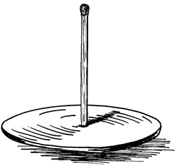 Одну и ту же фигурку можно употребить в дело много раз. Когда спички высохнут, они снова согнутся, фигурки примут первоначальный вид и будут пригодны для повторения опыта. Юла из спички Из тонкого, но плотного (тяжелого) картона вырежьте аккуратно кружок поперечником 4–5 сантиметров. Чем картон плотнее, тем лучше. Проще всего воспользоваться донышком круглой коробочки. Заострите спичку на конце и проткните ее через центр картонного кружка, предварительно проделав отверстие острием циркуля. Кружок должен сидеть примерно в сантиметре (даже меньше) от острого конца спички. Чтобы он не спадал, а держался прочно, капните у центра немного густого клея. Теперь юла готова.