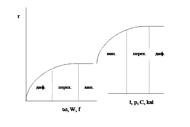 Один и тот же процесс в зависимости от условий проведения может протекать в разных областях. Если изобразить на графике зависимость скорости процесса от гидродинамических факторов, то та область, где скорость сильно возрастает при увеличении ω, W, f, является диффузионной. При дальнейшем увеличении этих величин зависимость становится менее выраженной – это переходная область. В кинетической области гидродинамические факторы перестают оказывать влияние на скорость процесса. Увеличение скорости в этой области требует использования кинетических факторов управления процессом (t, p, C, kat). Однако и здесь постепенно степень влияния выбранных инструментов управления снижается, процесс переходит опять в диффузионную область.
