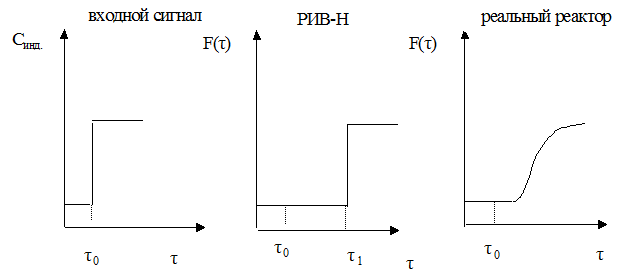 Выходной сигнал при ступенчатом входном сигнале используют для определения интегральной функции распределения F(τ); дифференциальная функция распределения f(τ) соответствует кривой отклика на сигнал импульсной формы.