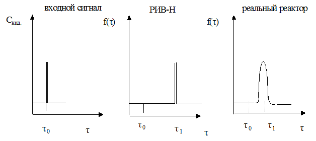 Экспериментально функции распределения времени пребывания могут быть найдены путем исследования так называемых кривых отклика. Суть этого метода состоит в следующем. На входе в реактор создается некоторое возмущение. Таким возмущением является введение в основной поток вещества (индикатора), отличающегося по какому-либо свойству: окраске, электропроводности, оптической плотности, кислотности, радиоактивности и т.д.). Индикатором может быть вещество, которое не изменяется и не поглощается в ходе эксперимента; концентрация его должна легко контролироваться.