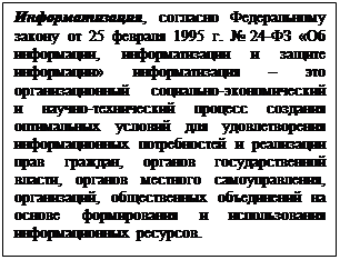 Информатизация Российского общества – организованный процесс создания оптимальных условий для удовлетворения информационных потребностей граждан, органов государственной власти и производственных организаций на основе формирования и использования информационных ресурсов.