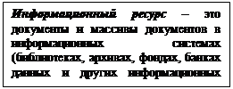 Информационные ресурсы России являются громадным по объему, стоимости и сложности комплексом, включающим базы данных, электронные информационные массивы, библиотечные и архивные фонды и т.п.