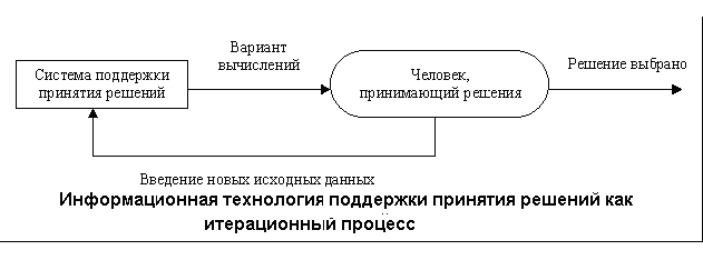 Представляют собой системы, разработанные для поддержки процессов принятия решений в сложных мало структурированных ситуациях, связанных с разработкой и принятием решений. Главной особенностью информационной технологии поддержки принятия решений является качественно новый метод организации взаимодействия человека и компьютера. Выработка решения, что является основной целью этой технологии, происходит в результате итерационного процесса, изображенного на рисунке, в котором участвуют: