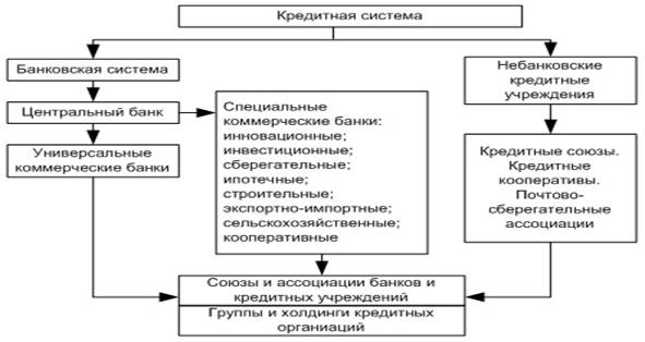 Кредитная система государства складывается из банковской системы и совокупности, так называемых небанковских банков, т. е. небанковских кредитно-финансовых институтов, способных аккумулировать временно свободные средства и размещать их с помощью кредита.