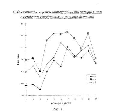 Диаграммы испол-о зуются, главным образом, для изображения соотношении между величинами. Это способ графического изображения величин при помощи фиг\р ('секторов, столбцов и т п i, плошади которых пропорционально! эти." величинам. На рисунке 1 представлена диаграмма субъективных оценок интенсивности чувств v леш с сгрдечно-сослдястыми расстройствами. На оси абсцисс отложены номера чувств, данные о которых получены из опросника. Ось ординат оцифрована в стандартных баллах.