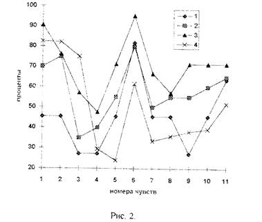 На диаграмме (рис.2) линия 1 соединяет проценты встречаемости чувств при нейроциркуляторной дистонии {а= 1.3), линия 2 — гипертонической болезни (п=24), 3 -— швем и ческой болезни сердца (п=26). 4 — у здоровых людей (п=349).