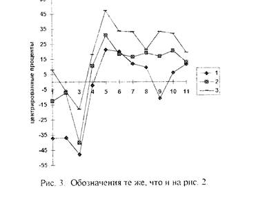 встречаемость признаков у разных подвыборок (частей выборки) с встречаемостью по всей выборке в целом. С этой целью может быть использована диаграмма центрированных процентов встречаемости. Для того чтобы легче было увидеть возможности диаграмм, по-разному представляющих данные в центрированных вел1гчинах, приведены диаграммы с величинами в процентах и центрированных процентах. На рисунке 2 представлена диаграмма встречаемости чувств (в процентах) у лиц с сердечнососудистыми расстройствами и здоровых. На рисунке 3 -— диаграмма центрированных процентов для той же выборки. Проценты для каждого чувства, подсчитанные на выборке здоровых, вычтены из соответствующих процентов грех групп лиц с расстройствами. Таким образом, на этой диаграмме представлены не абсолюгные величины процентов, а только величины отклонений процентов для трех групп (от процентов в выборке здоровых).