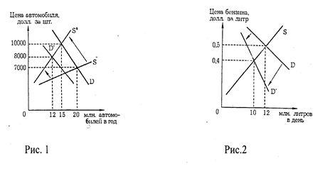 Теперь рассмотрим условный пример с ростом цен на автомобили. Предположим, что цена на автомобили поднялась с $7000 до $10000. Это вызовет снижение продаж с 20 млн. до 15 млн. автомобилей в год. (Рис. 1, S)