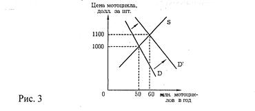 Рост цен на автомобили заставит некоторых потребителей отказаться от покупки нового автомобиля и обратить внимание на товары-заменители. Возможно, что высокая цена на автомобиль расширит спрос на мотоциклы или заставит дольше эксплуатировать старые автомобили. Предположим, что изменение произойдет именно на рынке мотоциклов, и объемы их продаж возрастут с 50 млн. до 60 млн, единиц в год. Это приведет к повышению цены за мотоцикл с $1000 до $1100. (Рис. 3)