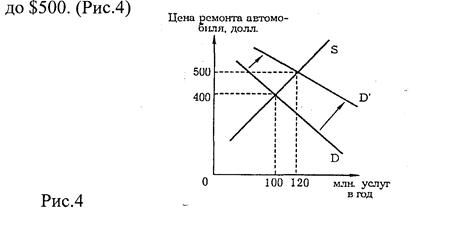 В результате более широкого использования старых автомобилей и расширения спроса на товар-заменитель(мотоцикл), спрос на новые автомобили упадет до 12 млн, в год. Это заставит снизить стоимость автомобиля с $10000 до $8000. (Рис.1, S).