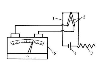 1 – датчик; 2 – термопара; 3 – реостат; 4 – батарея нагрева; 5 –гальванометр.