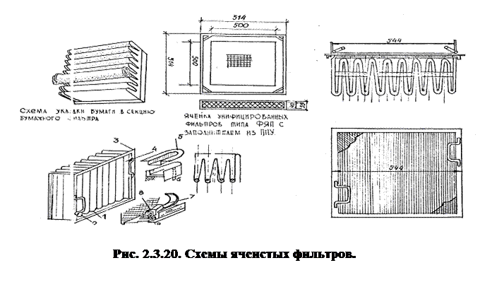 При невысокой концентрации тонкодисперсной пыли менее 5 мкм (до 10-15 мг/м³) для очистки проточного воздуха применяют ячеистые фильтры (рис.2.3.20). Они представляют собой металлическую коробку, заполненную фильтрующим материалом. Заполнителями могут быть стальные гофрированные сетки (фильтры ФЭР), винипластовые сетки (фильтры ФЯВ), модифицированный пенополиуретан (фильтры ФЯП) и стекловолокнистый фильтрующий материал (фильтры ФЯУ). Стальные и винипластовые сетки в фильтрах смачивают маслом с целью повышения их пылеулавливающей способности. По мере забивания фильтров пылью их регенерируют путем промывки в щелочном растворе (металлические сетки), либо промывкой в воде с последующей продувкой сжатым воздухом (пенополиуретан), либо просто заменяют загрязненный фильтрующий материал новым. Эффективность пылезадержания фильтров на атмосферной пыли составляет 60-80%, удельная воздушная нагрузка равна 7000 м³/(ч*м²). При увеличении сопротивления фильтра от начального значения 50 Па до конечного – 150 Па пылеемкость фильтров (способность поглощать пыль) составляет от 350 (для ФЯП) до 2600г/м² (для ФЯВ).