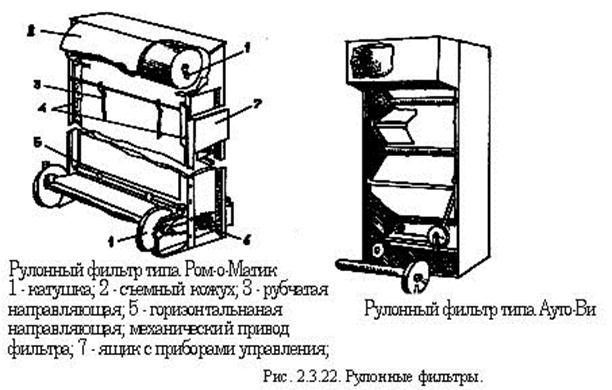 В рулонных фильтрах (рис.2.3.22.) для очистки воздуха используют стекловолокнистые капроновые или бумажные фильтрующие материалы, изготовленные в виде полотнищ длиной 15 … 20 м.