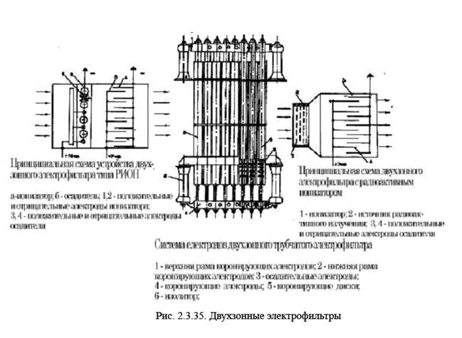 Из формулы (2.3.37) видно, что скорость осаждения очень сильно зависит от напряженности электрического поля и диаметра частиц пыли. Электрофильтры бывают однозонные и двухзонные (рис.2.3.25). В однозонных фильтрах зарядка (коронирующие электроды) и осаждение пыли (осадительные электроды) осуществляется в одной зоне, а в двухзонных – этот процесс протекает в двух зонах. Если пыль способна взрываться, то применение электрофильтров категорически запрещено.