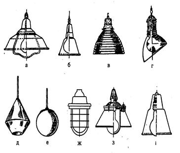 Рис. 2.4.7 Светильники ламп накаливания:а – «Универсал» (У, УМ); б – глубокоизлучатель эмалированный(ГЭ); в – глубокоизлучатель зеркальный (ГЗ); г – кососвет; д – люцета с сплошным стеклом (НСП-07); е – шар матового стекла(ПО-02); ж– взрывозащитный герметичный(ВЗГ); з – промышленный уплотненный(ПУ); и – прямого света «Альфа».