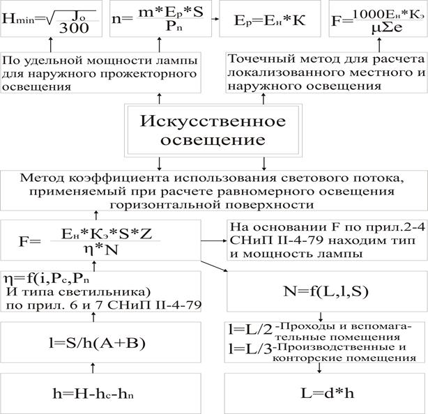 При проектировании искусственного освещения применяются три метода: точечный, метод использования светового потока и метод расчета по удельной мощности (рис2.4.8).