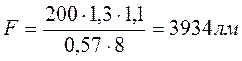 Расстояние от стены до светильника принимаем l=0,8 м. С учетом коэффициента светового потока (отношение потока, падающего на расчетную поверхность, к суммарному потоку всех ламп η=0,57) рассчитываем световой поток при числе светильников N=8.