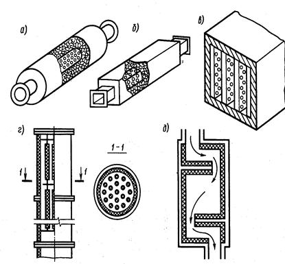 Абсорбционные глушители снижают шум на 5 – 15 дБ за счет поглощения звуковой энергии звукопоглощающими материалами, которыми облицована их внутренняя поверхность. Они могут быть трубчатыми, пластинчатыми, сотовыми, экранными. Последние устанавливают на выходе газа в атмосферу или на входе в канал. Реактивные глушители снижают шум в резонансных камерах на 28 – 30 дБ (рис. 2.5.7.)