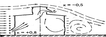 Рис. 2.7.1 Распределение давления воздуха при действии ветра в здании и около него