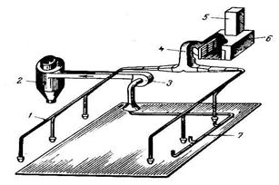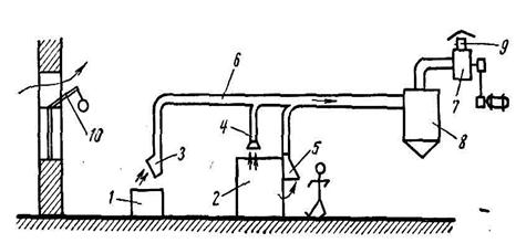 1,2-источники вредностей; 3,4,5-отсосы загрязнений; 6-воздуховод; 7- вентилятор; 8-циклон; 9-патрубок выброса загрязнений наружу; 10-подача чистого воздуха