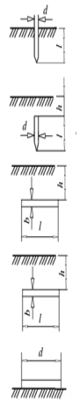 | Труба, стержень у поверхности земли Труба, стержень на глубине h'; h= h'+1/2 Протяженный за-землитель (полоса, труба) на глубине А, ширина b Кольцевой зазем-литель (полоса, труба) на глубине h Круглая пластина на поверхности земли (диаметр d) | |